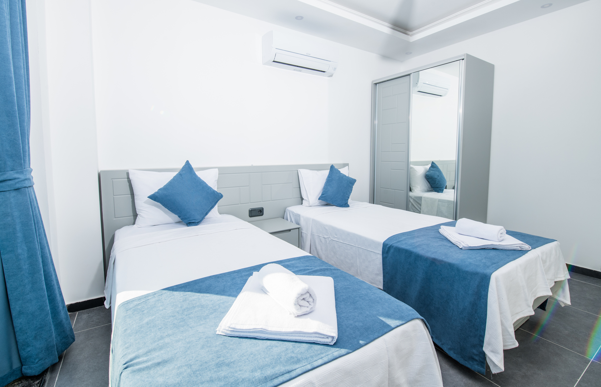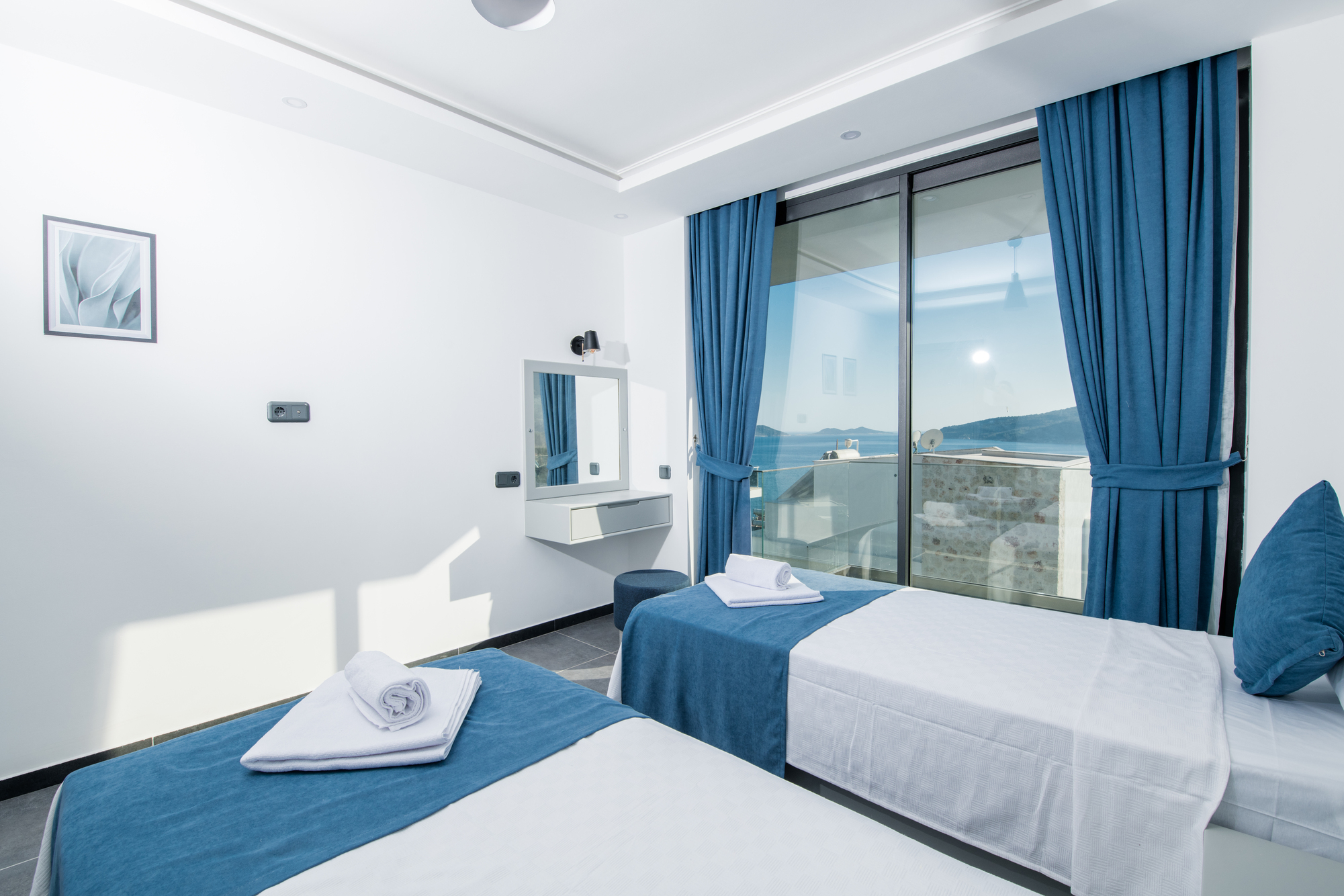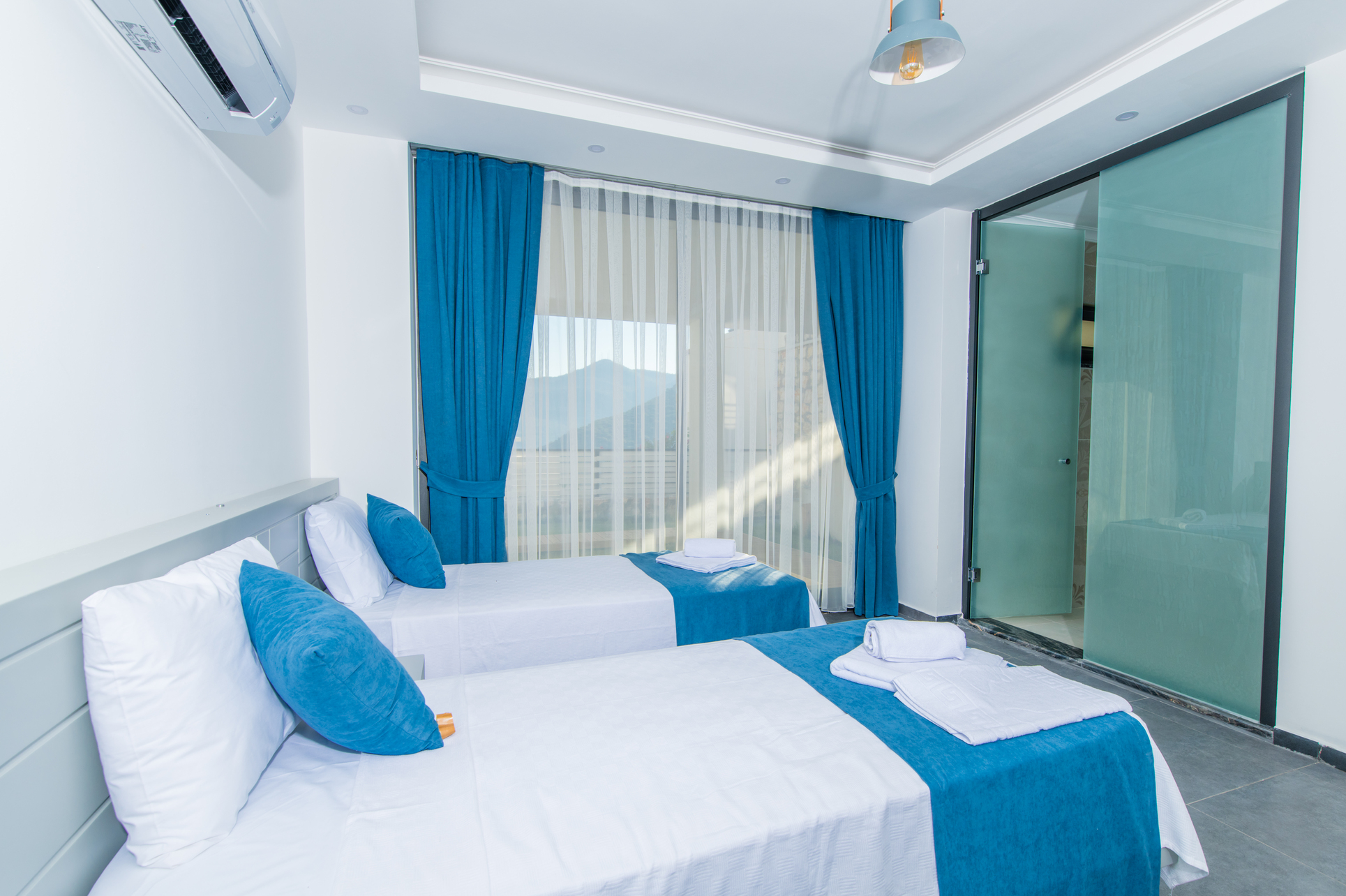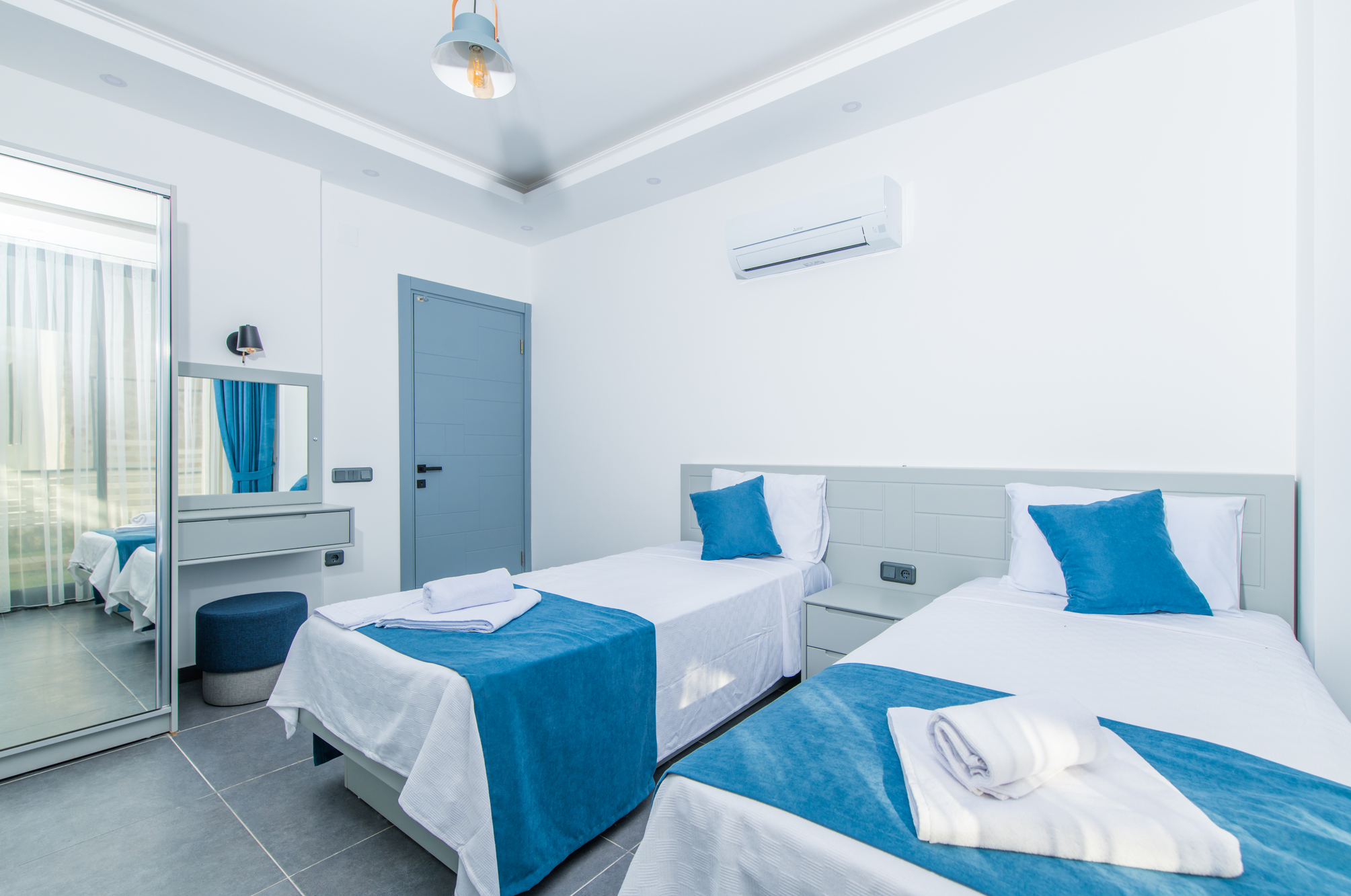 Bedroom 3: Two single beds, private balcony, wardrobe, bedside tables, air conditioning, en-suite bathroom