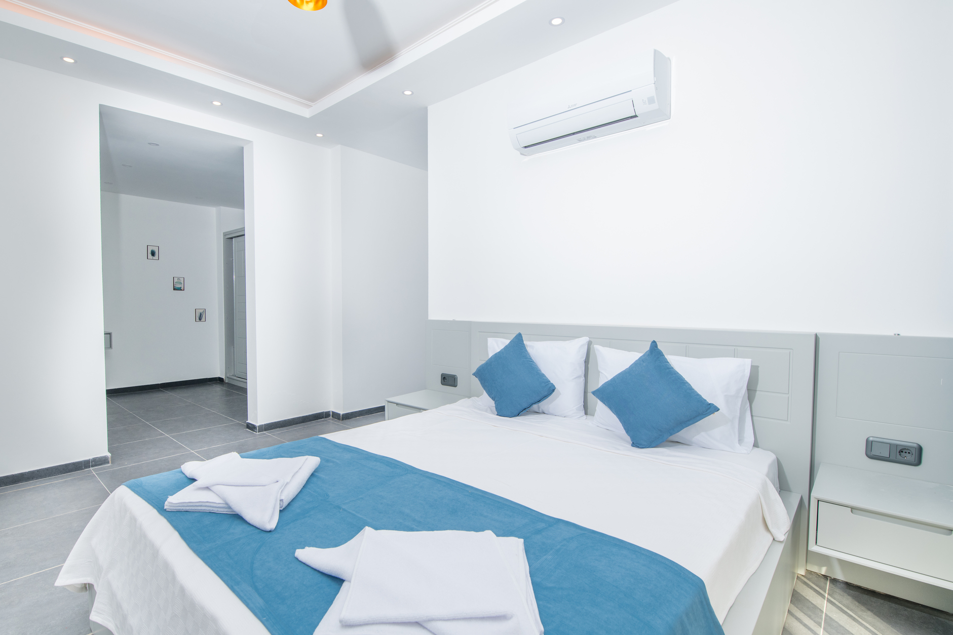 Bedroom 2: Double bed, private balcony, wardrobe, bedside tables, air conditioning, en-suite bathroom