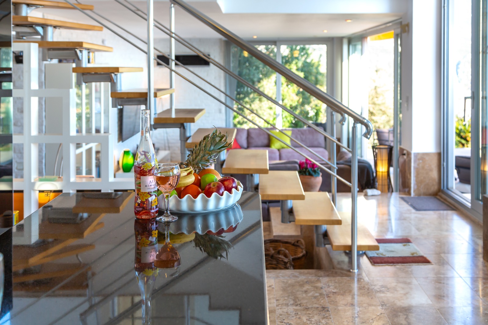 The modern American-style kitchen is fully equipped with high-quality appliances, including a refrigerator, dishwasher, washing machine, microwave oven, electric kettle, and a four-burner hob. A dining set for ten people, complete with glassware, is also provided.