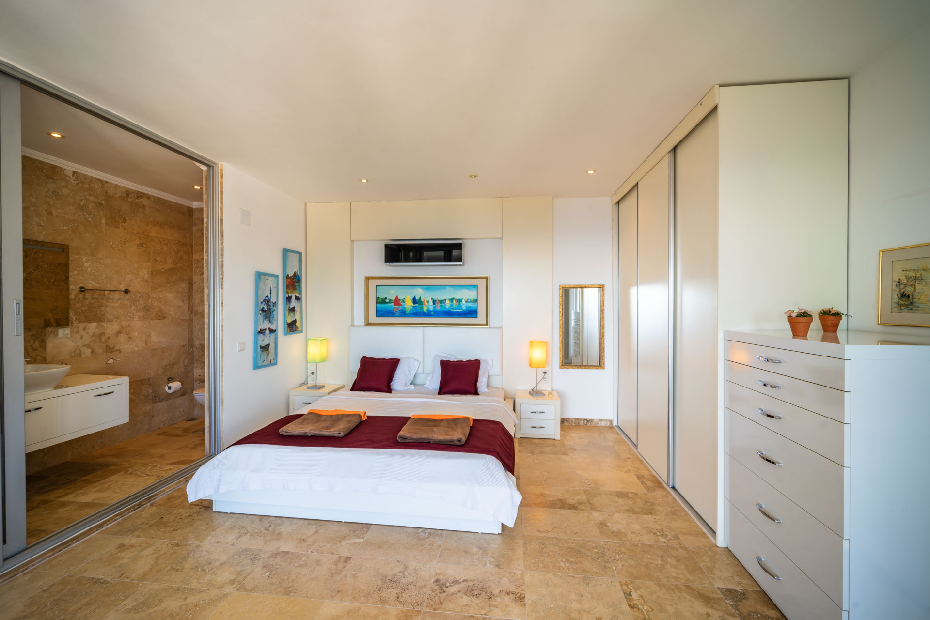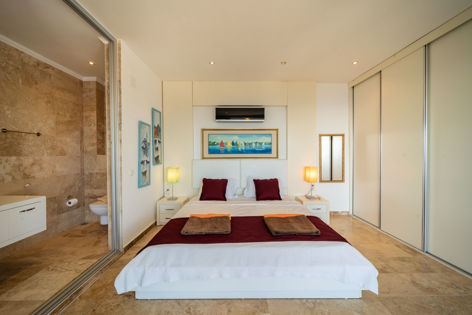 - Bedroom 1: Master bedroom with a double bed, wardrobe, bedside tables, vanity table, air conditioning, and an en-suite bathroom with a toilet.